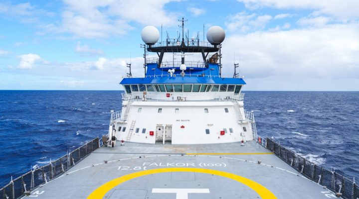 La campaña se enmarca en un Acuerdo entre el Servicio de Hidrografía Naval (SHN) y el Schmidt Ocean Institute. Participan investigadores y técnicos de distintos institutos y organismos nacionales. (Imagen: El buque Falkor (too) en navegación. Créditos: Schmidt Ocean Institute.)